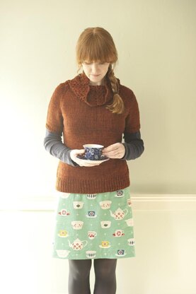Coralina with its lovely lace, cable cowl, and short sleeves is an ideal piece for layering. Waist shaping and ribbed sleeve and bottom trims add flattering elements. Worked in a worsted weight yarn, it’s also quick to knit!