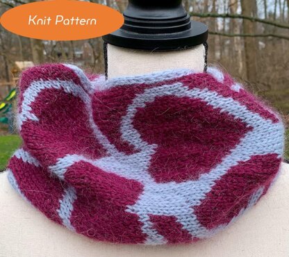 The Corazón Cowl is a stranded colorwork cowl worked flat. It has a heart motif of two columns of hearts, with an i-cord edging. The cowl is worked as a long rectangle, then seamed together.