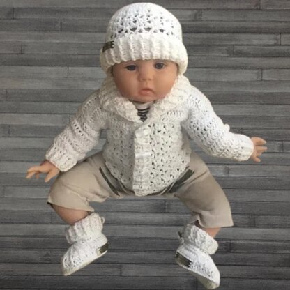 Crochet a shawl-collar cardigan, hat, and booties set for newborn size. The sweater is worked seamlessly from the bottom up, the hat is worked top down in the round, and the booties are worked bottom up with size adjusted by hook. A timeless newborn set for everyday wear and special occasions that makes thoughtful handmade baby gifts.