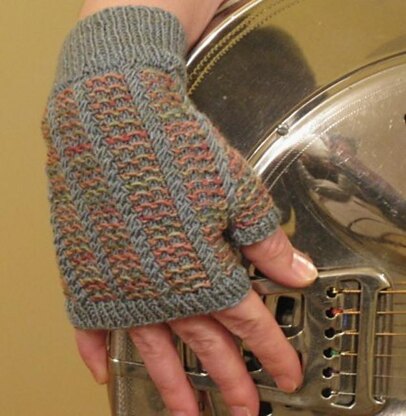 These lovely little fingerless gloves feature a two-colour slipped stitch pattern accented by columns of miniature twisted cables. They are intended to be close-fitting without restricting finger movement. The pattern creates a stretchy fabric so the gloves will suit a variety of hand sizes.