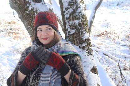 This is a pattern for a pair of muffatees and matching hat worked from the bottom up and in the round, using the stranded colourwork technique.