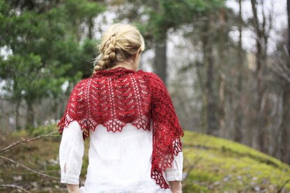 Red shawl used 110g Madelinetosh Tosh Merino Light in Tart 100% merino, 420 yd/384 m per 100g on 4 mm (US 6) needles. Blocked size is 58 x 145 cm (23 x 57 inches). Gauge is 17 stitches per 10 cm in stockinette.