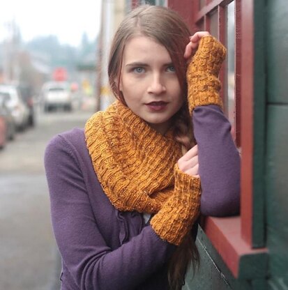 This pattern is for a tapered cowl and a pair of simple cuffs with a slot for your thumb. The cowl and the cuffs are all worked in the round. The cowl is tapered by changing needles as you work up to the neckline.