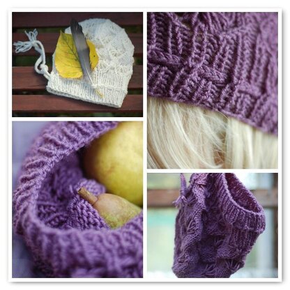 Cornflower is a spring/autumn hat knit in an interesting stitch pattern of eyelets and elongated stitches that's actually very simple to work (watch the videos to see for yourself). It will keep your hair out of your eyes on blustery days, and thanks to the braided tie, it'll stay on your head too!