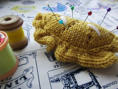 This is a pattern for a Cornish Pasty Pin Cushion. It is made in two pieces, the main piece is a circular knit shaped by increases. The edging is in stocking stitch. You will need toy stuffing. Any small amount of dk yarn can be used.