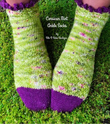 Corsican mint socks are inspired by my summer ground cover; Corsican mint. It spreads asymmetrically throughout my garden in a lush green carpet with delicate purple flowers. The lightest brush, step, or breeze produces the most refreshing spearmint scent, and the flavor is bright and welcoming.