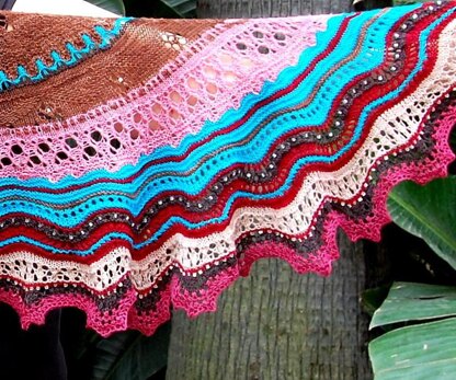 This colourful crescent shawl was designed specifically for the Miss Babs Polydactyl set. (Solids or solid + variegated set, 7 colours of 38g each)