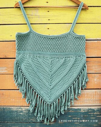 This seamless crochet tank top is first worked from the bottom up as two identical triangle panels. These panels are then joined together and you start constructing the tube top in the upper bust. The straps and tassels are added last.