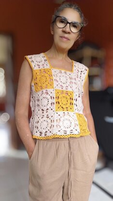 This garment is crocheted using 100% cotton yarn and is quick to make, constructed from a small number of modular squares. The design features a straight neckline that contrasts with the soft shaping of the armholes and hem.