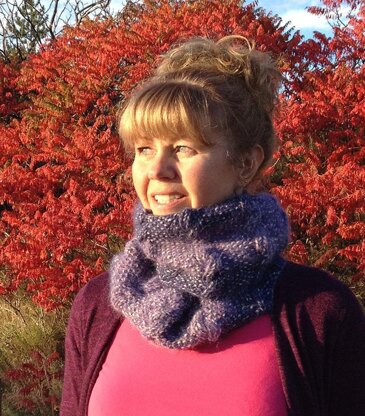 A warm reversible cable and moss stitch cowl which can be worn long or doubled up around the neck. It is knitted in the round with no seams so when you have finished knitting it is ready to wear!