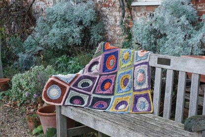A versatile design which can be made in a single colour or multiple colours. The sample uses 4 colours in each square. Each sample colour is used once in each segment (i.e. each colour is used to work each round of the design once, but across 4 different squares).