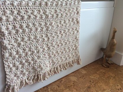 This lovely soft and richly textured mat is made using 100% cotton and the finished product is surprisingly lightweight. It is suitable as a bath mat, rug or throw. The pattern is made by alternating rows of staggered bobbles with double crochet (single crochet US) and finished off with a beautiful full chain fringe or you could omit the fringe if you prefer.