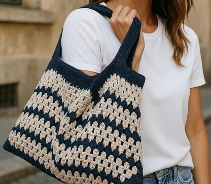 Made with 100% pure cotton DK yarn (James C Brett) in Black and Sand, it’s durable, breathable, and designed to stretch — comfortably fitting two beach towels plus all your seaside essentials.