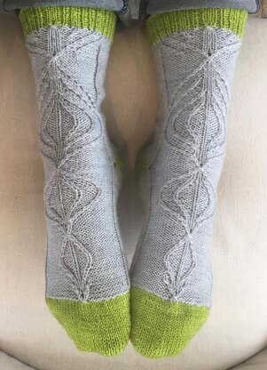 In the true spirit of spring, this sock design is toe-up, beginning with the first sprout of a seedling, emerging in full flower at the top of the cuff.