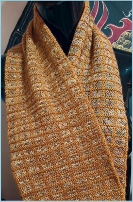 This dotted block two-color slipped stitch pattern in the colorways depicted produces a tweedy effect in an accessory suited to a weekend in the country. It is quite an easy knit: no edging stitches are necessary due to the stability provided by the pattern itself.