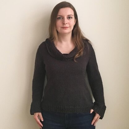 The couthy cowl sweater is easy to knit and has a lace neck and cuffs. It is knitted seamlessly in the round and has some shaping at the waist.