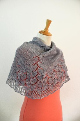 Cove Bay is knitted in one piece top-down. Its centre spine wanders gently across the stocking stitch ground before growing organically into the beautiful lacy edging motif.