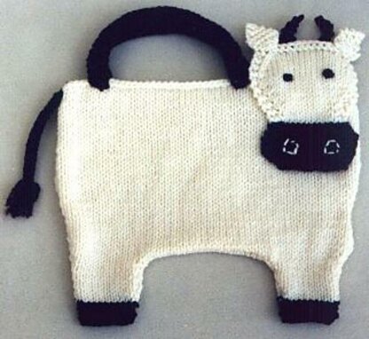 A cutest ever cow shape bag! This was styled for children, but we find adults and teens just love this bag as a novelty too! The handle of the bag is at the top of the cow back. Knit the two sides , then sew together. Easy directions to follow along with. Uses worsted weight yarns, and knitting needles, US # 7. You will need a 9” skirt zipper to close top of bag, if desired. Make one of these up to be a “knitting bag” for your cow collector friends! Finished size is about 11” high.