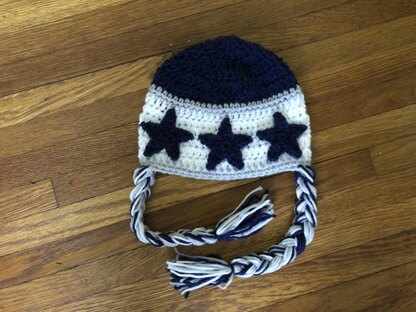 Football fans love to support their team. This Dallas Cowboys theme inspired hat is created with their colors; navy, silver and white. Easy to follow directions are even suitable for beginners. Four sizes are included in this pattern so you can make a hat for your family members. Looks with our without braids.