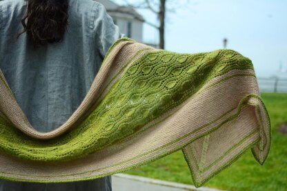 This two-color rectangular wrap is worked from the center out. It begins with a long strip of a lace pattern. Stitches are picked up around the edges, and the garter stitch border is worked in the round from there. Increases are worked at the corners.