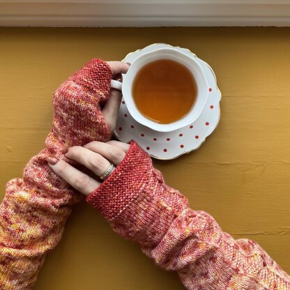 Pattern Notes: This pattern can be knit with the magic loop method or with DPNs. They're knit from the bottom cuff upward, with a thumbhole rather than a gusset and thumb. One size option is included, with notes for where to adjust size if desired. The hand section is more fitted and knit as written fits a 7-7.5 inch/18-20 cm palm circumference.