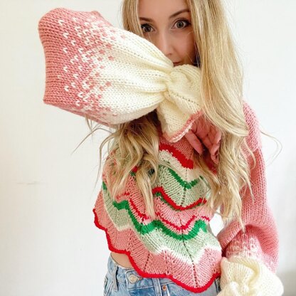 Inspired by a pulled Christmas cracker I’ve used a striking chevron stitch to create its jagged hem. The sleeves were inspired by the making of snow balls dipping them in to snow.