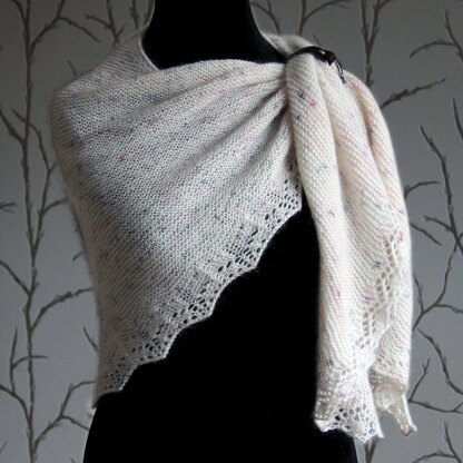 Cranachan is a knitting pattern as delicious as its namesake. With masses of cosy and luxurious garter stitch for easy knitting, a delicate lace edging adding interest and completed with a beautiful rippling border, this asymmetrical shawl is a fun and engaging knit! Designed with three sizes in mind, you can pick the one that works best for you! Knit it with 100g of 4 ply weight yarn for a neat shawlette or with 300g for a shawl that almost doubles as a blanket!. The sample is knit with 200g of Eden Cottage Yarns Coniston Fingering, for a shawl that’s easy to wear, cosy and so fluffy!