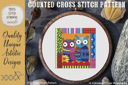 A wonderful Crazy Patch Owl counted cross stitch design.\nGreat stitched individually or partnered with the other 11 Crazy Patch Owls!\nExclusive licensed artwork by Clipartopolis.\nCross Stitch by Marcia Manning.\nDesign is 66 x 66 stitches in size.\nPDF is a COLOR counted cross stitch chart which lists suggested DMC floss colors, and includes a color picture.\nStitched design size is as follows:\nSize 11 count: 6.00 x 6.00 inches or 15.24 x 15.24 cm\nSize 14 count: 4.71 x 4.71 inches or 11.97 x 11.97 cm\nSize 16 count: 4.13 x 4.13 inches or 10.48 x 10.48 cm\nSize 18 count: 3.67 x 3.67 inches or 9.31 x 9.31 cm\nSize 22 count: 3.00 x 3.00 inches or 7.62 x 7.62 cm