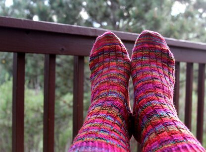 These socks have a lot of color and texture. This pattern uses knit and purl stitches only, making it fun and non-intimidating. Also, a great take-along project. This pattern is knit in the round on DPN’s. The pattern is easy to memorize, and that makes this the perfect sock to knit.