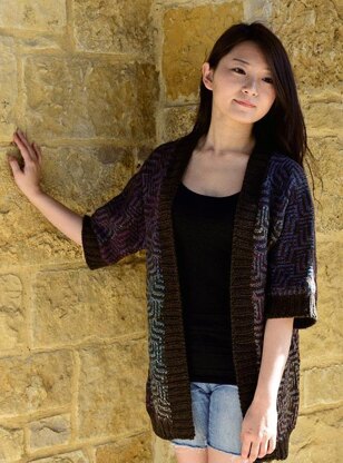 (5, 5, 6, 7, 8) balls of Jojoland Rhythm Superwash and (3, 3, 3, 4, 4) balls of Jojoland Baritone Superwash (100% wool, 110 yards per ball). Sample is made with color RS101 and BS375. U.S. size 7 (4.5 mm) needles. U.S. size 6 (4.0 mm) double point needles or circular needle for sleeve knitting.