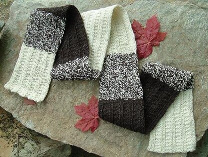 A one-row, reversible, garter rib scarf with blocks of color perfect for showing off special hand spun fibers. The blocks of color allow the knitter to use as much or as little handspun as they want. Commercial yarns can be chosen for the other blocks.