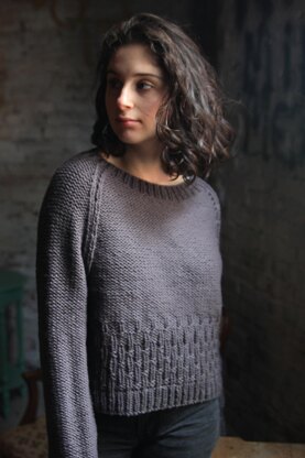 A simple pullover, knit seamlessly from the bottom up. Lovely detail at cuffs and hem is echoed along sides and seams. Chunky yarn means it will knit up in no time! For fit shown, I suggest about 4-6"/10-15.25cm positive ease.