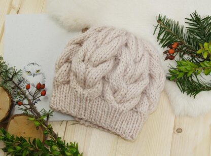 **Design details:**● allover cable beanie hat ● worked in the round from brim to crown ● ribbed and cable pattern ● integrated round shaping creates a 6 petal crown