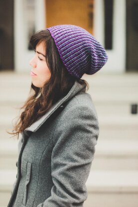Play with colour in this fabulously simple hat loaded with soft texture, strong lines, and chic, cozy comfort. The unique cast-on, complete with tutorial, teaches a fun new skill while the stitch pattern is deliciously simple.