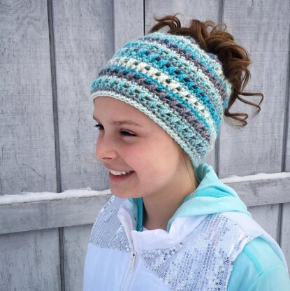 This is a PDF crochet pattern for a beanie with a hole in the top to allow for a ponytail or messy bun. The hole uses an elastic hair tie to stretch over a bun but still stay snug for a ponytail. Keep your hair up and out of the way but still stay warm!