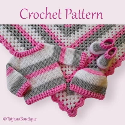 Crochet pattern baby blanket, sweater, hat and booties. ♥♥♥ Blanket measures approx. 30" x 30" (76cm x 76cm) - an ideal size for prams, pushchairs, car seats and moses baskets. Sweater, Hat & Booties size in this pattern: 0 - 3 MONTHS.