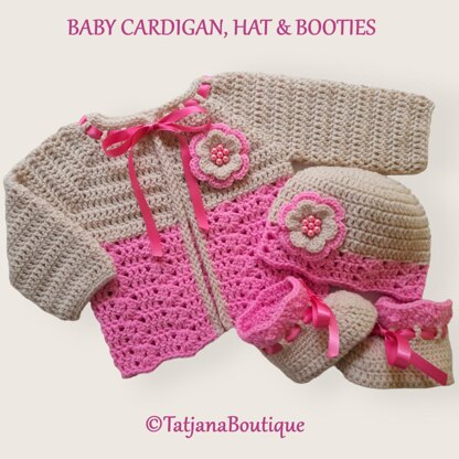 Crochet Pattern baby cardigan, hat and booties set decorated with crochet flowers, pearl beads and satin ribbon. ♥♥♥ Size in this pattern 3 - 6 MONTHS. The pattern is written in US crochet terms but with a conversion at the beginning of the pattern to UK / Australian terms. Its just that some of the names of the stitches are different. Materials & tools you will need: ★ Acrylic or other yarn 150 gr approx. - DK, Double Knitting in UK, Light Worsted in the USA, 8ply in Australia. ★ Crochet hooks sizes recommended 4 mm and 4.5 mm. ★ 14 pearl beads in pink colour (optional). ★ 2 m satin ribbon in pink colour.