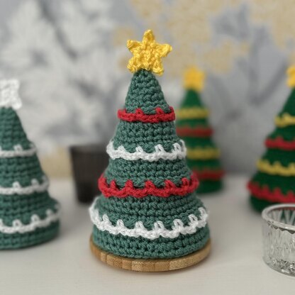 The crochet pattern is 5 pages long and has instructions (with lots of photos to help) to make 3 different sized Christmas trees. The sizes are as follows: