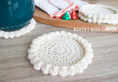 Finished cup coaster measures 4.25" in diameter. Worsted weight cotton yarn is used for this pattern.