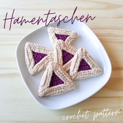 Hamantaschen is a triangular shaped cookie filled with jelly or chocolate and eaten at the jewish holiday, Purim. Crochet some for yourself or for a loved one, to help celebrate the joyous holiday this year!