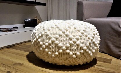 This pouf is fun to make, it works up very quickly and is perfect to be used as a seat, a table and a footrest when needed.