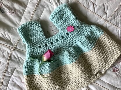 Breezy summer dress with motif at hem. Unique design and so chic for your special little one. Simple crochet stitches throughout.