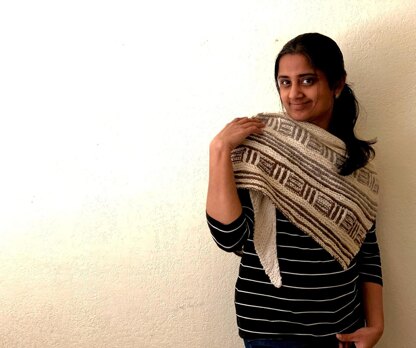CROMULENT SHAWL is an asymmetric triangular shawl with a bias knit body and a simple yet striking border. The border features horizontal and vertical stripes achieved using garter and brioche stockinette stitches.