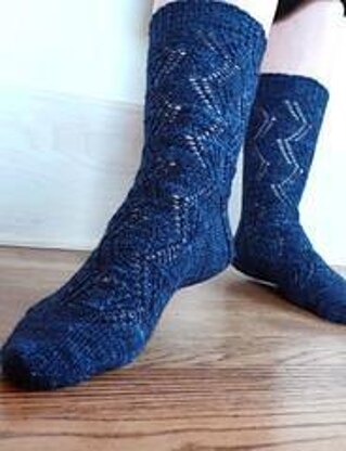 Twist stitches and eyelets splash a crazy path down the leg and over the foot of this top-down sock in four sizes S(M, L, XL). The constant directional changes in the pattern create a strong surface texture for a fine, soft sock yarn. Can be reversed for toe-up construction. Substituting yarn and/or needles may result in an overall variation in size.