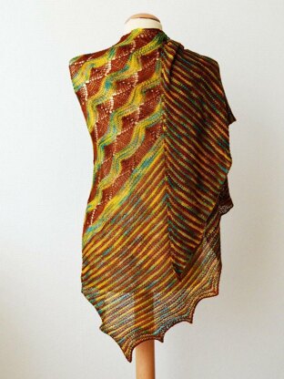 Crops of Harvest is a stylish triangular shawl knit sideways. There is just something about the combination of striped garter stitch and lace that appeals to me. Lazy mindless knitting, together with lovely lace, makes it a perfect choice to combine a solid/tonal fingering weight yarn with a variegated one. What’s not to love?!