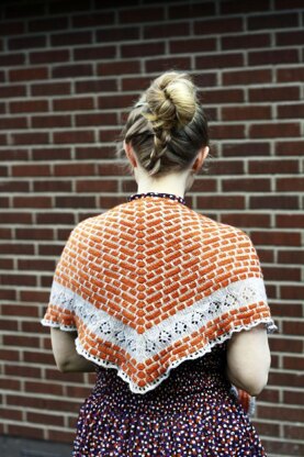 Cross Bond is a slip stitch patterned crescent shawl. It requires approximately 300 meters of main colour (mortar) and 250 meter of contrast colour (bricks) using lace or fingering weight yarn. The shawl can be enlarged by adding additional repeats.