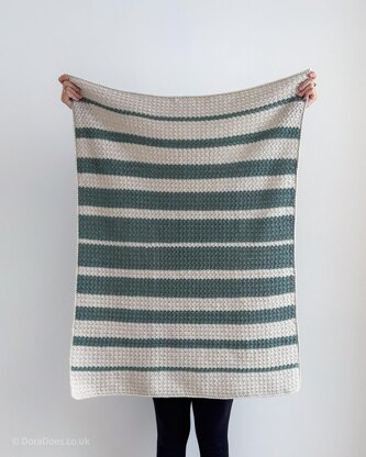 A simple, beginner friendly textured crochet blanket which uses asymmetric stripes to create a pleasing cross fade. The pattern is worked in rows with striped colour changes. The border uses yarn over slip stitches worked into single crochets and row-ends.