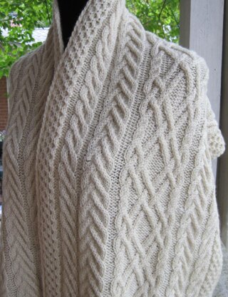 This is a pattern for an ornately cabled shawl, which is 20 1/2 inches wide and 74 inches long. There are also instructions contained within the pattern for a stole, (15 1/2 inches wide); a wide scarf (11 1/2 inches wide, and a narrow scarf, (7 inches wide) giving you the choice of what you’d like to make. This stole is knitted with light worsted weight. It is composed of 4 distinct Aran Cables, much like the Fisherman Shawls of yester-year. The stitches are Charted ONLY. Skill Level: Intermediate (assuming a very good working knowledge of cabling .) There are also instructions for an optional crocheted border, should you want it edged. The yarn used in the sample is Handmaiden’s Organic Chinook yarn, however any fairly light worsted weight yarn will work for this pattern