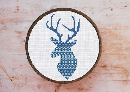 Modern counted cross stitch chart \n"Blue Head Deer with Ornament" cross stitch pattern by Leonor Kiokiz available as a Downloadable PDF\n\nThis pattern includes:\nв… list of DMC colors and color image of the finished design\nв… Colorised symbol chart \nв… Black and white symbol chart \n\nв… Size: 46 x 90 stitches\nв… Stitches Required: Full cross stitches\nв… Floss: DMC\nв… Colors Required: 2 colors\n\nв™Ў Perfect for beginners в™Ў