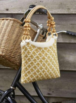 Pattern for Crosses Mosaic Bag, originally published in Simply Knitting. The pattern is a mosaic stitch, with garter stitch at the top. It has lining and wadding inside, and is finished with bought handles, with wooden beads.